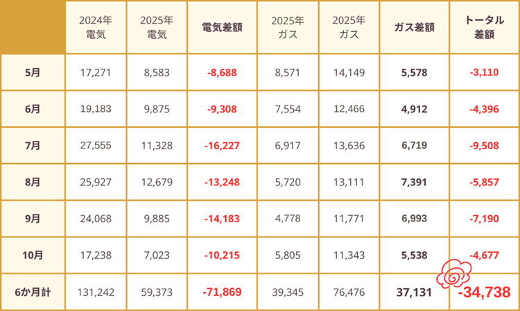 2024年5~10月と2025年5~10月のガス料金